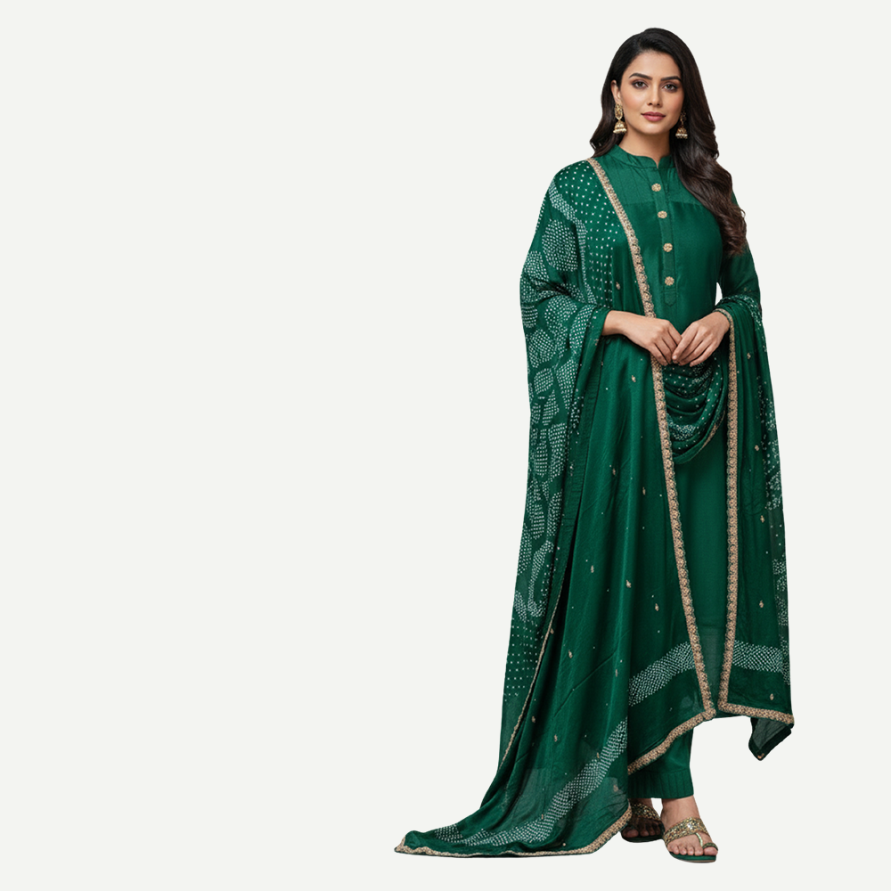 Chanderi Kurta Set with Heavy Neck Work & Ajrakh Dupatta
