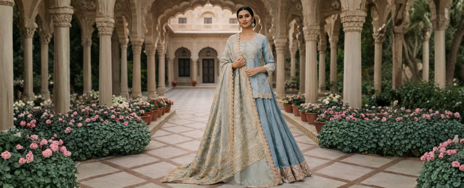 Blue Indo Western Lehenga with Zardosi, Sequin, & Pitan
