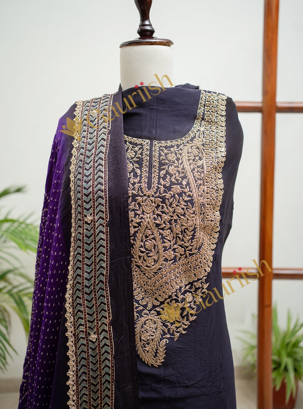 Indulge in timeless elegance with this exquisite Chanderi Kurta Set with Heavy Neck Work & Ajrakh Dupatta, featuring heavy work on the neckline and beautifully paired with a premium Ajrakh dupatta. The rich texture of Chanderi fabric adds a regal sheen, while the handcrafted Ajrakh print brings heritage character and artistic depth to the look. Ideal for festive occasions, wedding gatherings, cultural celebrations, and exclusive events, this outfit blends traditional luxury with modern sophistication.