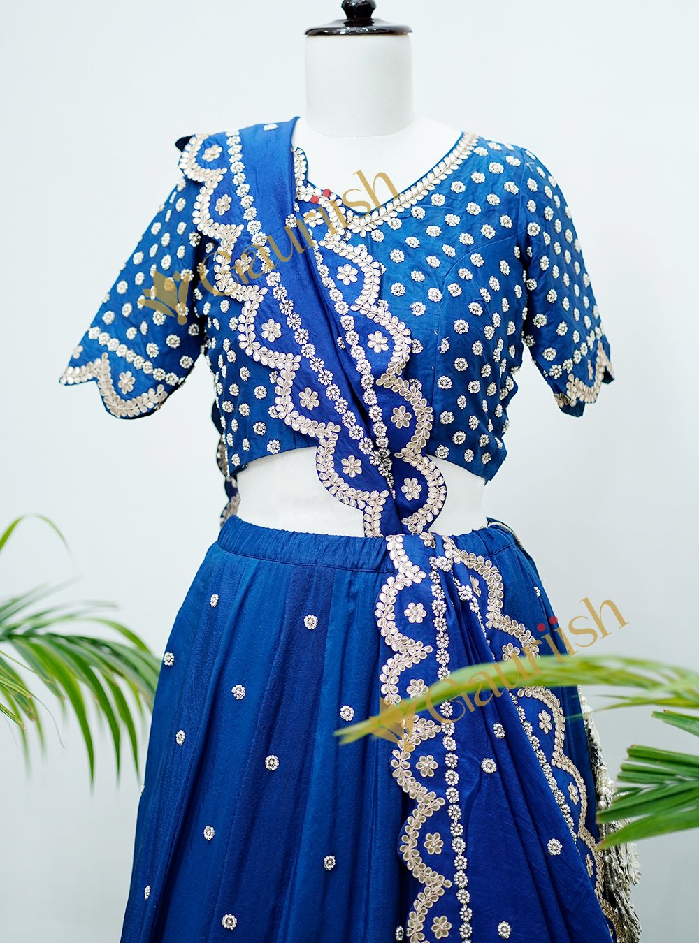 Expertly handcrafted, this elegant ensemble showcases intricate Gota Patti detailing combined with traditional Nakatikki embellishments, creating a rich and luxurious appeal. The beautifully designed lehenga and blouse are complemented by a coordinated dupatta, making it an ideal choice for weddings, festivals, and special celebrations.
