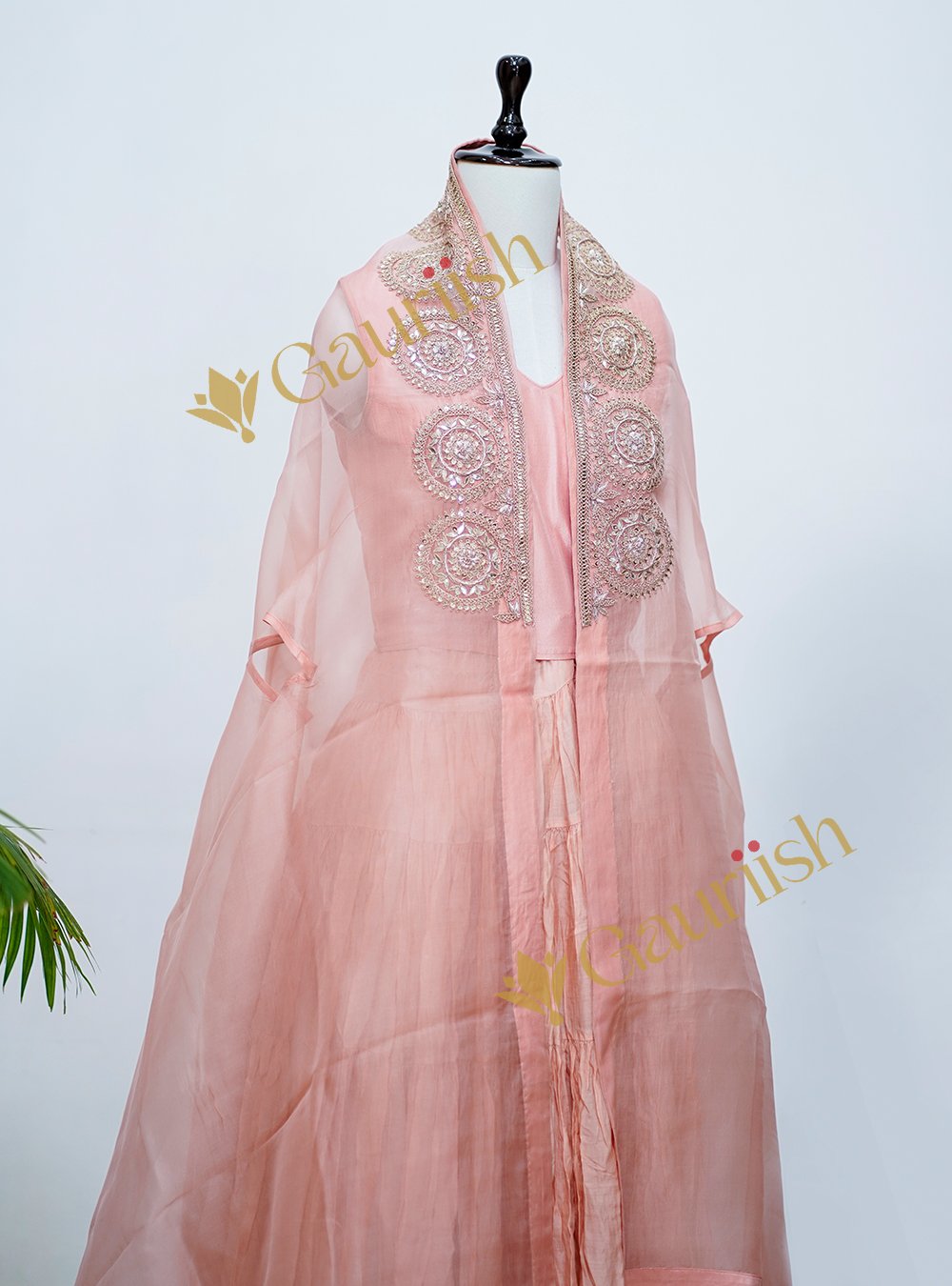 Organza Cape Sharara Dress with Marodi and Tikki Marodi Work crafted in lightweight organza, this ensemble features intricate hand embroidery that adds rich traditional charm to a contemporary cape silhouette. Paired with a graceful sharara, it is an ideal choice for weddings, festive celebrations, and special occasions—perfectly blending modern design with timeless Indian craftsmanship.