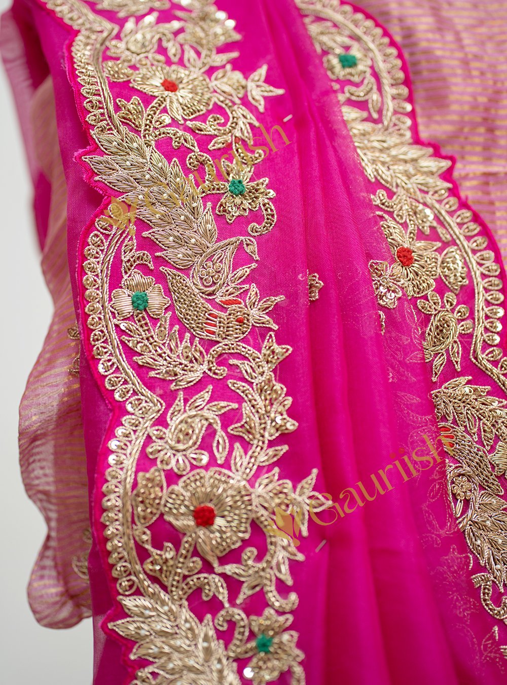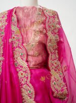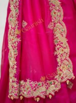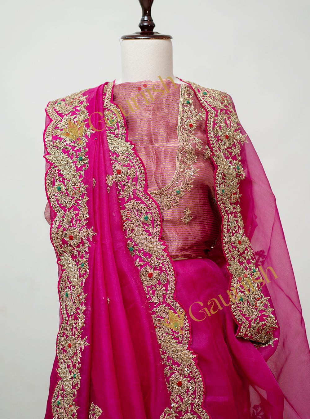 Organza Saree & Heavy Blouse crafted from luxurious crushed silk, this innovative ensemble offers the comfort of a lehenga with the graceful drape of a saree. The lightweight organza saree adds ethereal charm, while the heavily embellished blouse enhances its regal appeal—perfect for weddings, festive occasions, and statement celebrations.
