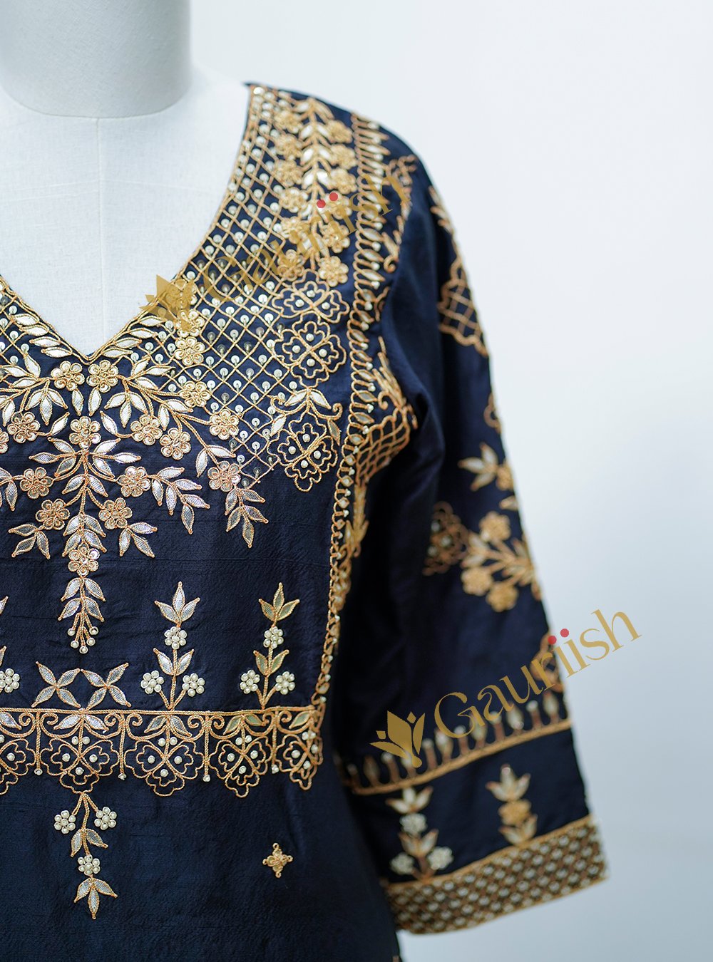 Chanderi Kurta Set with Heavy Neck Work & Ajrakh Dupatta