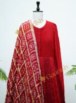 Red Anarkali with Gajji Silk Dupatta, crafted for grand celebrations, features rich traditional embroidery that adds royal charm and intricate detailing. The flowy silhouette enhances grace, while the vibrant red hue and silk dupatta elevate its festive appeal—perfect for weddings, festivals, and special occasions.