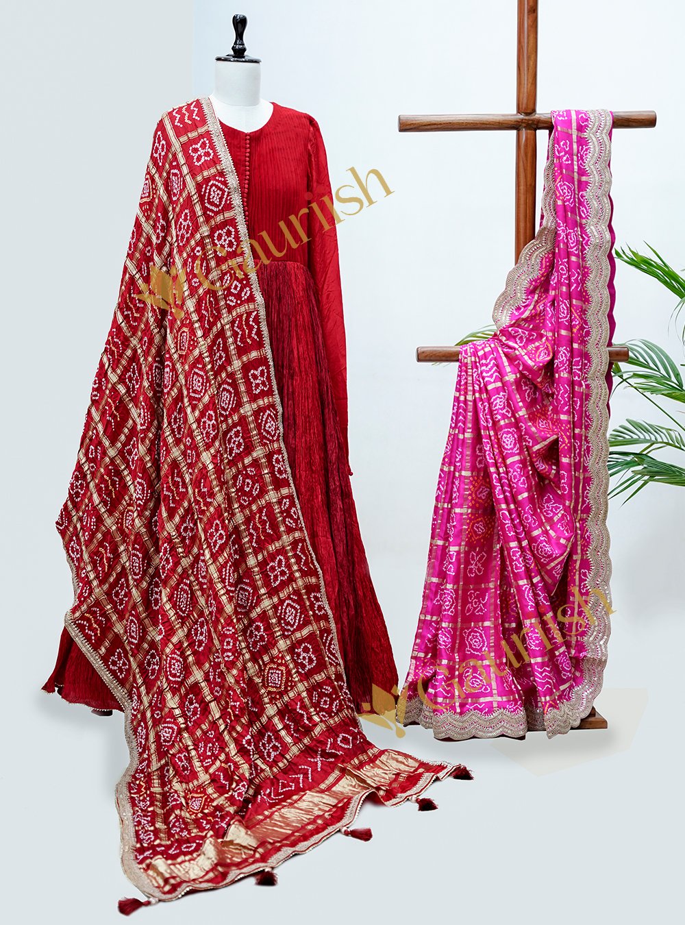Make a statement of timeless elegance with our Red Anarkali, paired with a luxurious Gajji Silk Dupatta and adorned with exquisite Gotapatti & Marodi work.